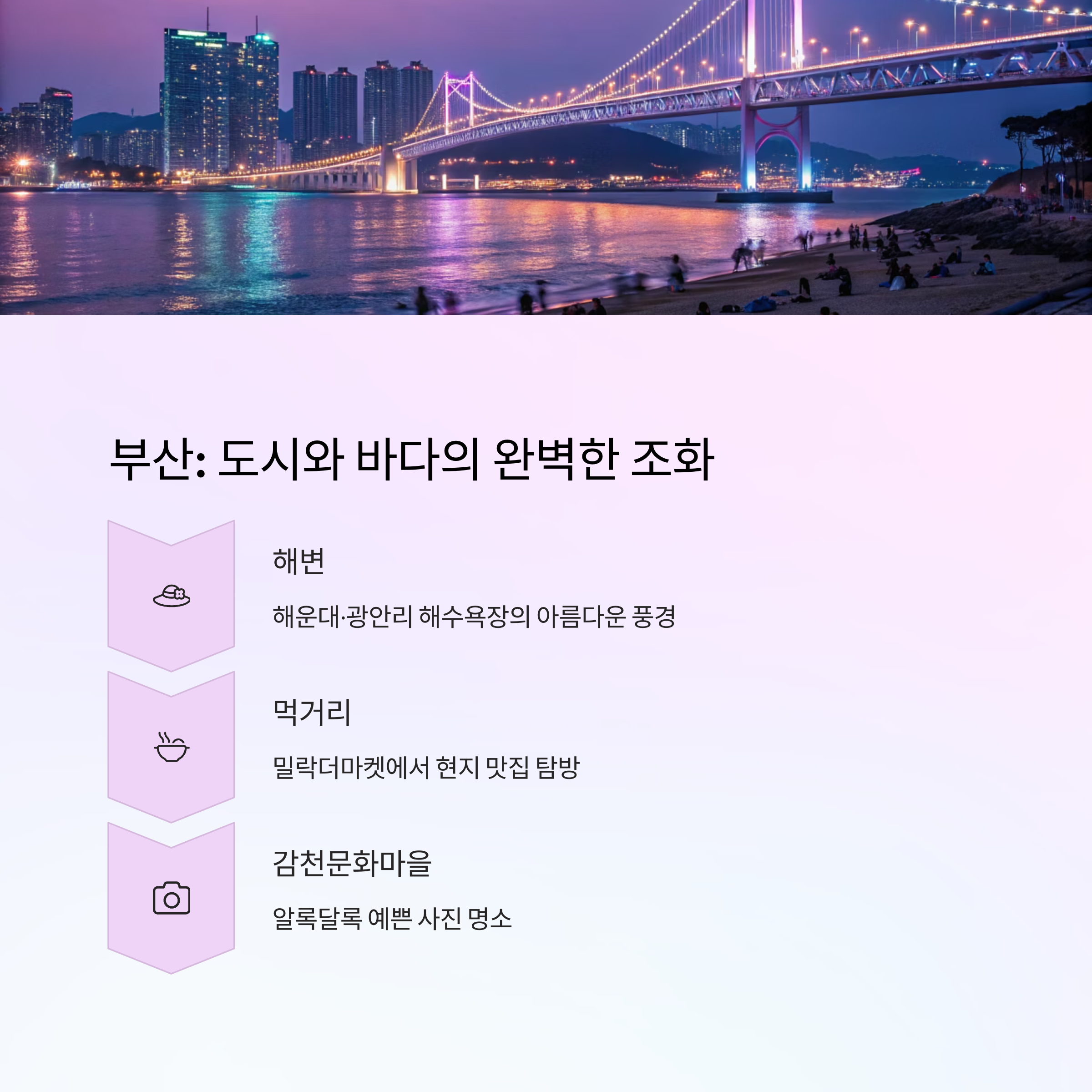 부산의 해운대와 광안리는 여름철 인기 해변으로 기분 좋은 해양 바람을 느끼며 여행할 수 있습니다.