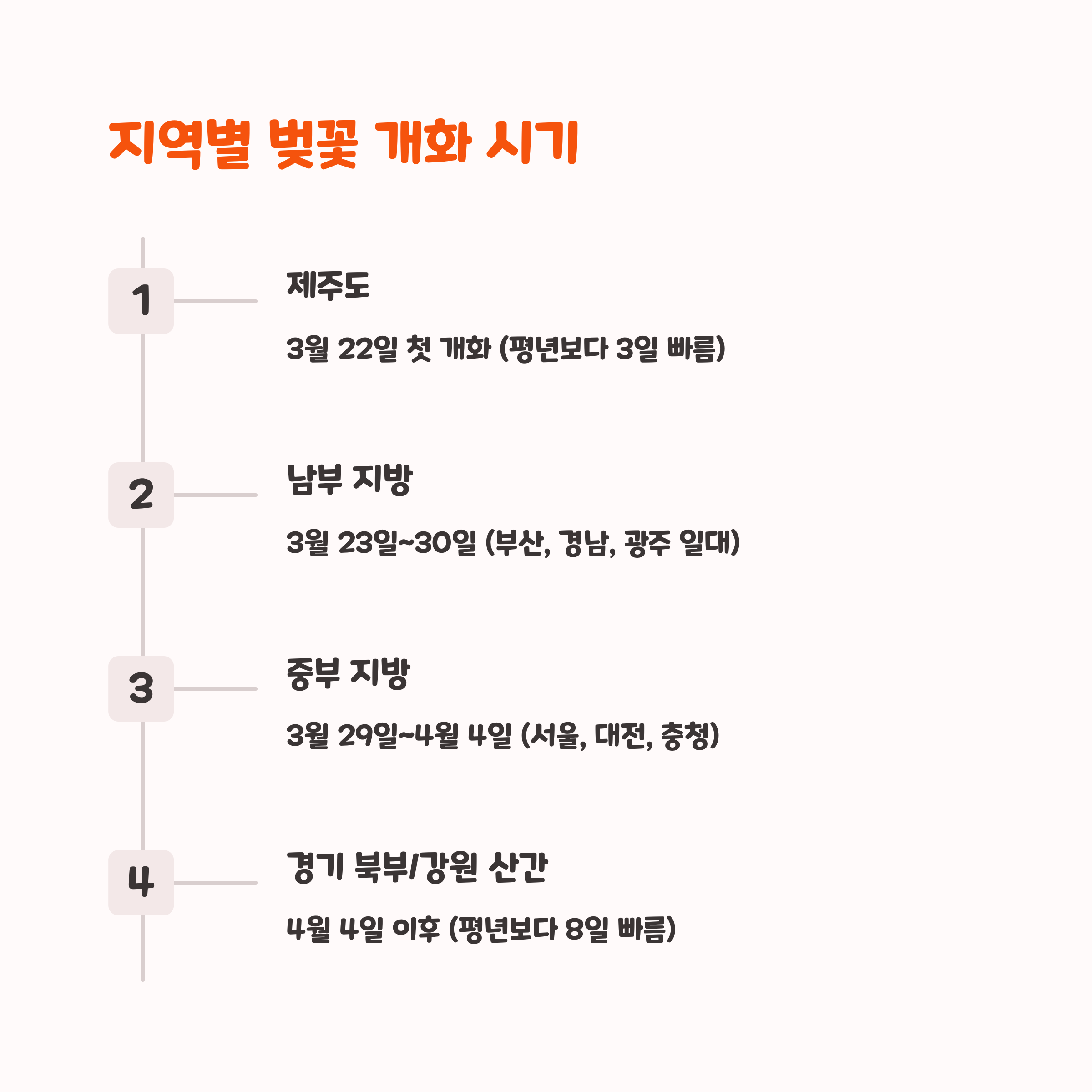 | 벚꽃 개화 시기 | 남부는 3월 말, 중부는 4월 초에 개화합니다. |