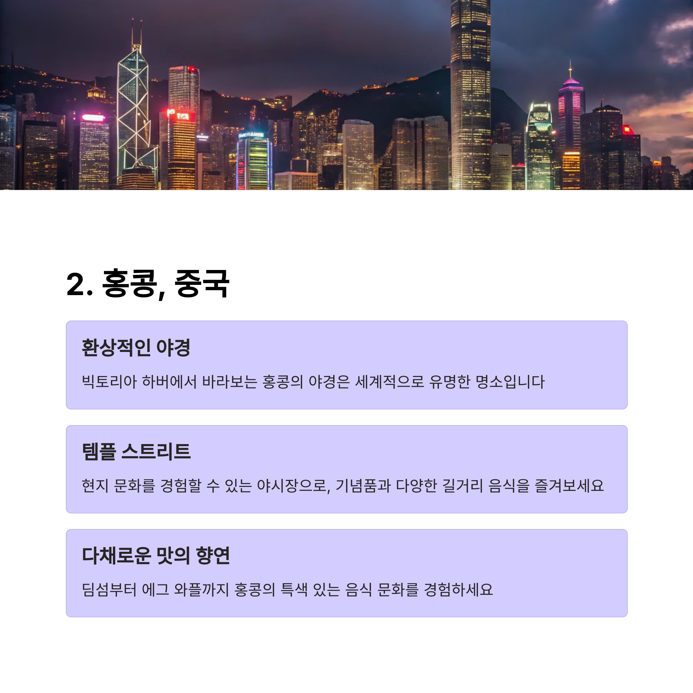도쿄와 홍콩은 도시적 매력을 제공하면서 문화 체험까지 가능하게 합니다.