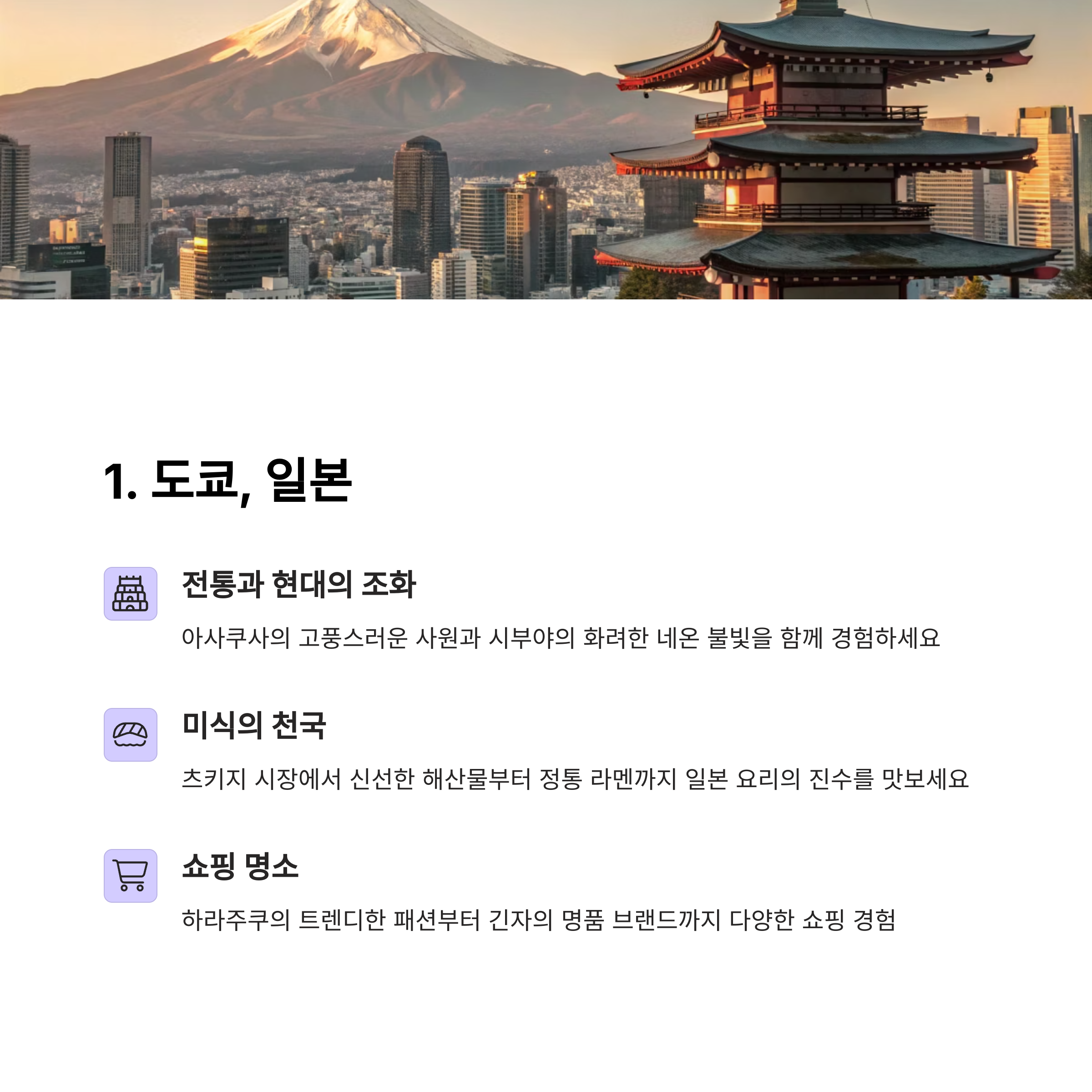 | 도쿄, 일본 | 전통과 현대의 조화 |