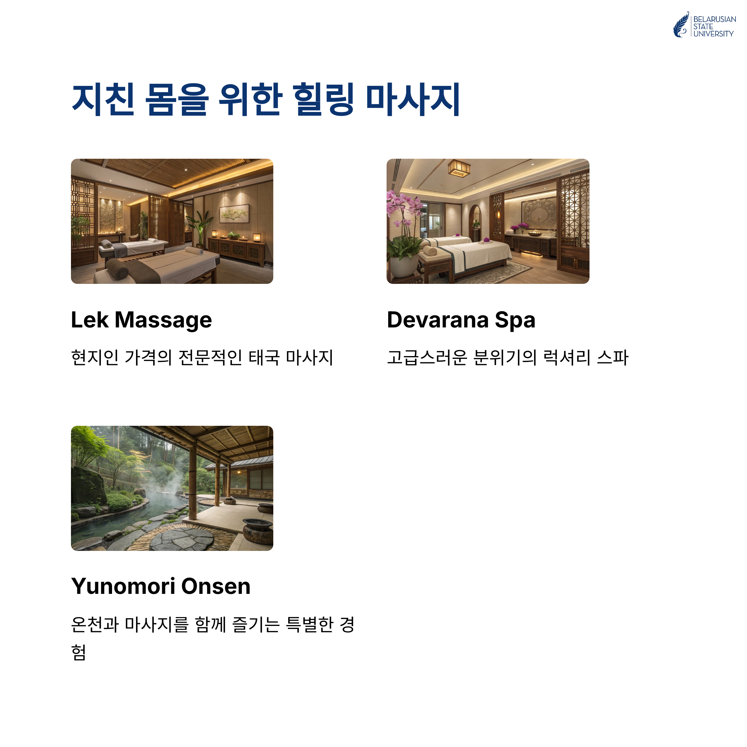 | 방콕에서 추천하는 마사지 샵은 Lek Massage입니다. 다양한 타이 마사지를 경험할 수 있는 곳입니다. Devarana Spa는 고급스러운 스파 서비스로 유명합니다. Yunomori Japanese Onsen은 독특한 일본식 온천 체험을 제공합니다. 방콕에서 마사지는 여행의 피로를 풀어줄 완벽한 방법입니다. |