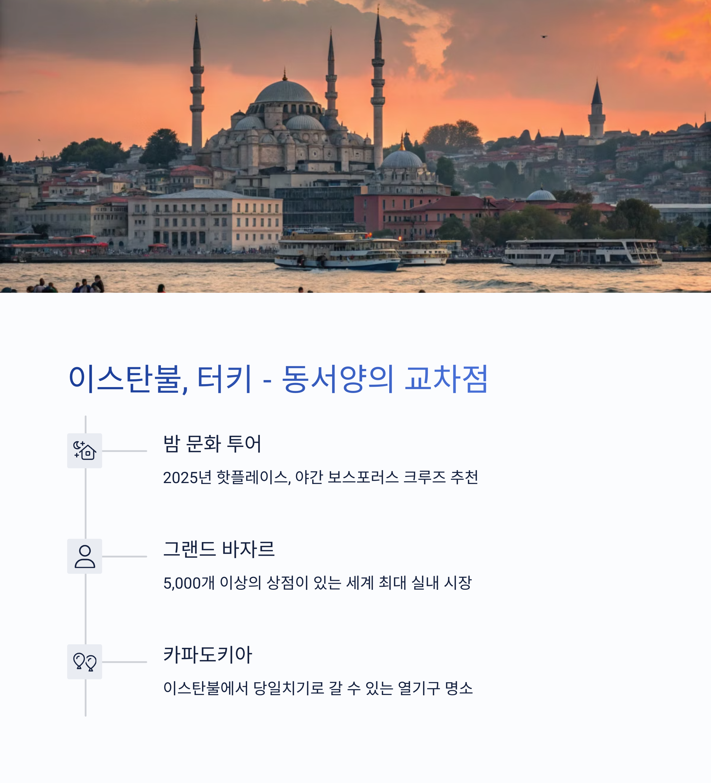 최근 여행 플랫폼 데이터를 보면, 호주 시드니가 뜨고 있습니다. 남반구에 위치한 시드니는 4~6월이 가을 시즌으로, 관광하기 가장 좋은 시기입니다. 대자연과 도시가 조화를 이루는 이곳은, 현지 체험과 맛집 투어까지 가능해 특히 30~40대 여성 여행객에게 인기가 높습니다. 또 하나 주목할 곳은 터키 이스탄불. 물가가 저렴하고, 역사적인 건축물과 이국적인 분위기를 동시에 경험할 수 있는 곳으로, 최근 여행 인플루언서들이 앞다투어 방문하는 도시이기도 합니다. SNS 인증샷 명소가 풍부한 것도 인기 요인 중 하나입니다.
