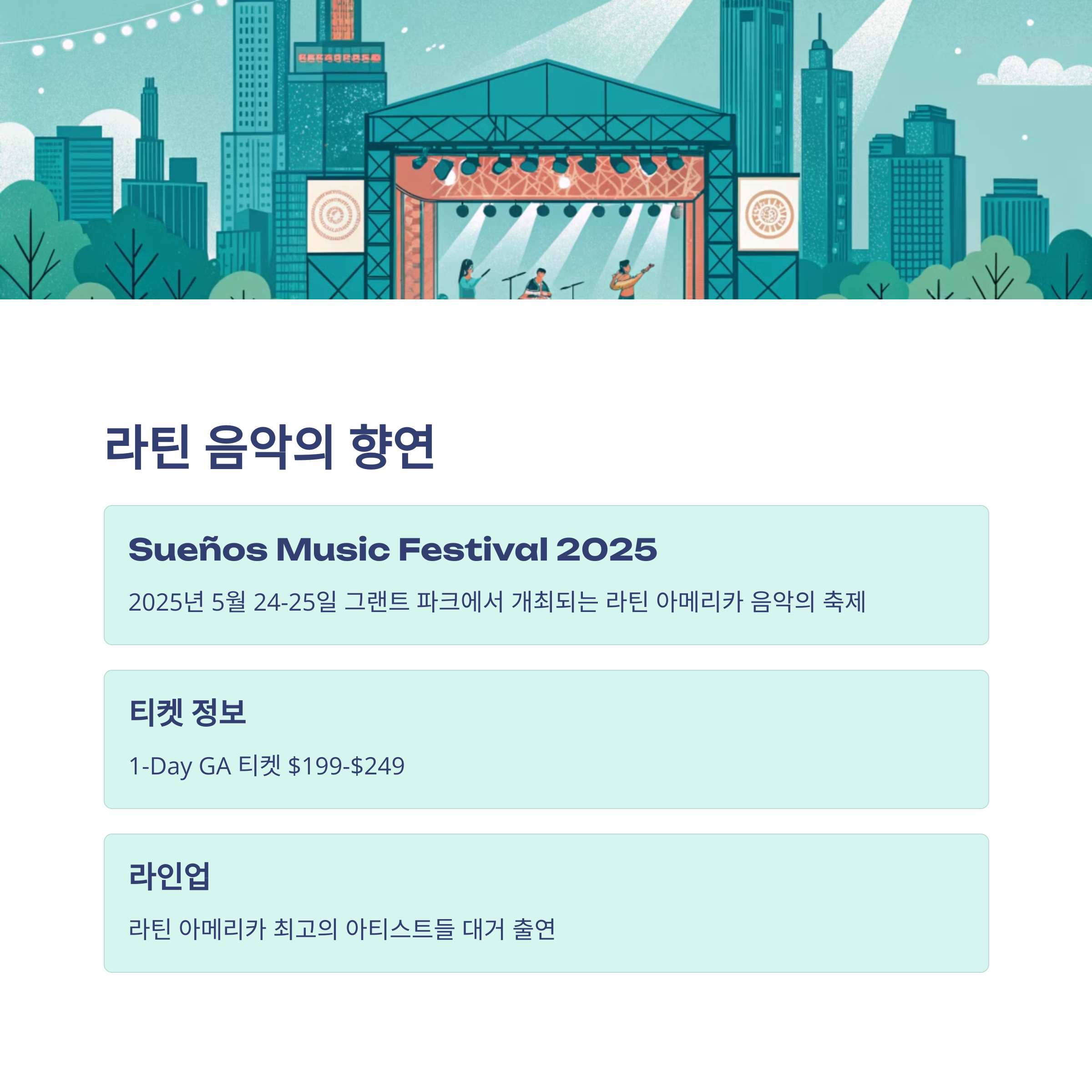 | Sueños Music Festival | 2025년 5월 24일~25일 | Grant Park | 1-Day GA: $199~$249 |